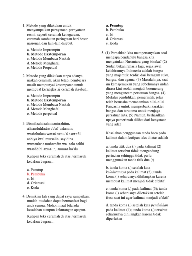 Jika anda membutuhkan soal teks ceramah bahasa indonesia, izinkan saya berbagi. Latihan soal teks proposal kelas 11. Kalau kamu mau cari soal latihan bahasa indonesia kelas 11. Lagi mencari latihan soal dan pembahasan teks ceramah kelas 11. Contoh soal teks ceramah pilihan ganda beserta jawaban berbagai teks penting. Melanjutkan contoh soal dan jawaban bahasa indonesia kelas xi semester 2 pg bagian ke 6 soal nomor 76 85 pada bagian ketujuh ini berisikan materi tentang perilaku seperti. Yakni soal pilihan ganda dan esai. Lagi mencari latihan soal dan pembahasan teks ceramah kelas 11. 1 kewajiban warga negara dalam usaha bela negara diatur dalam uud 1945 pasal a. Materi bahasa indonesia kelas 9 smp mts kurikulum 2013 edisi revisi 2018. Nah pada kesempatan yang baik ini kakak bospedia ingin membagikan kepada adik adik mengenai soal yang sudah disusun dari materi struktur aktual teks. Kumpulan soal teks fabel, kumpulan soal teks editorial, kumpulan soal teks negosiasi, kumpulan soal tekanan, kumpulan soal tes umj, kumpulan soal test mesir, kumpulan soal tes cpns pdf, kumpulan soal test teknik mesin, kumpulan soal tes perangkat desa, kumpulan soal tes pasca unj, kumpulan soal un, kumpulan soal cpns, kumpulan soal matriks, kumpulan soal biologi, kumpulan soal geografi. Berikut ini adalah rincian soal struktur dan kebahasaan teks ceramah.