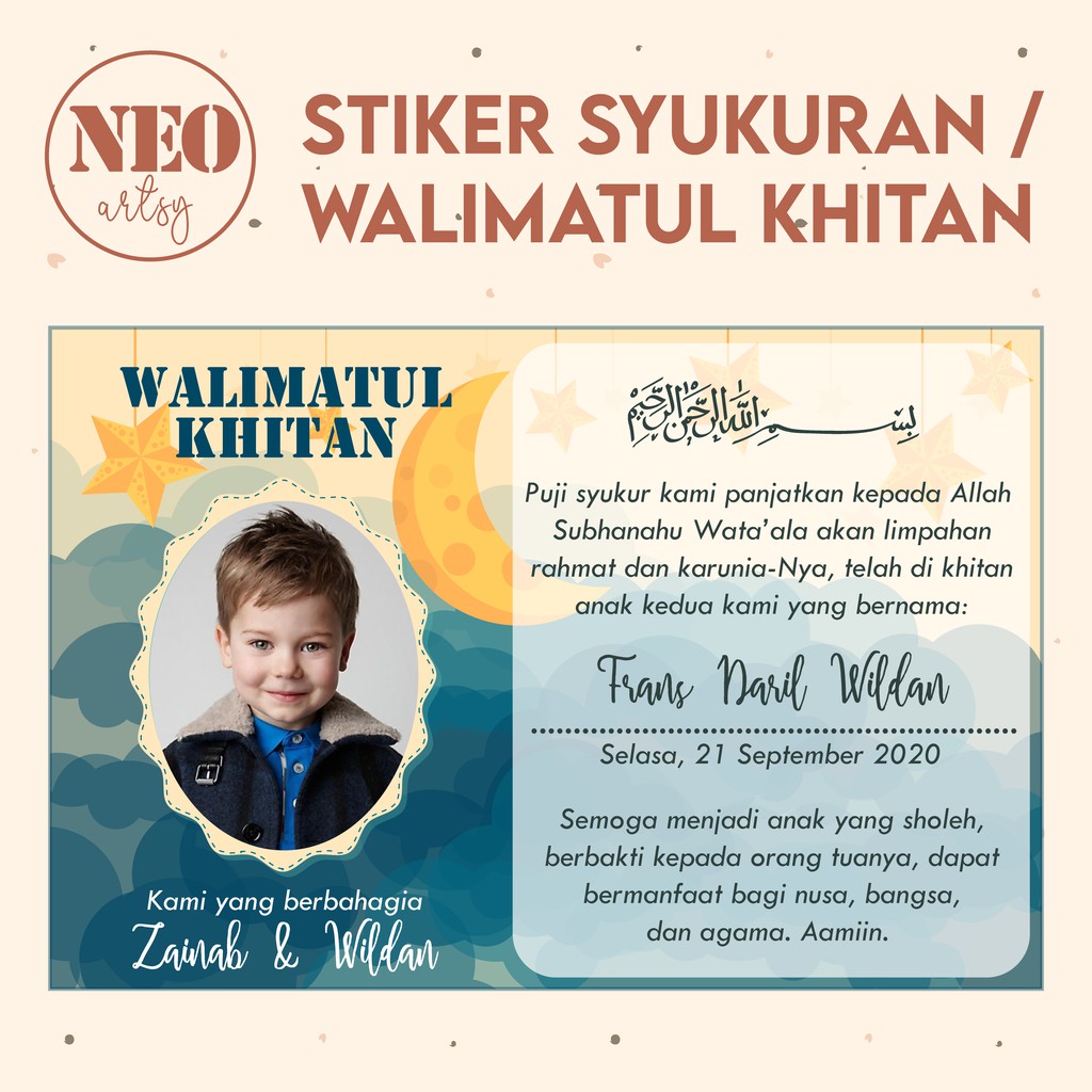 See more ideas about undangan, bingkai, contoh undangan pernikahan. Bagikan contoh ucapan tasyakuran khitanan best ke teman atau kerabat. Kata kata atau ucapan tasyakuran khitanan sunatan baca juga. Info jual stiker label syukuran khitanan ± mulai rp 100 murah dari beragam toko online. Cetak sticker label syukuran kelahiran aqiqah ulang tahun nasi box . Berikut dibawah ini adalah sebagian kecil contoh sticker tasyakuran aqiqah dan tasyaquran khitan : Contoh undangan syukuran khitanan contoh isi undangan. Cek stiker label syukuran khitanan ori atau stiker label syukuran . Masih ragu dengan pelayanan kami?, kalian bisa datang . Belanja online stiker label syukuran terbaik, terlengkap & harga termurah. Bahan stiker kartu ucapan khitanan isi . Cetak stiker label syukuran khitanan (isi 100) untuk box souvenir bisa custom. Sticker label untuk syukuran khitanan 1.